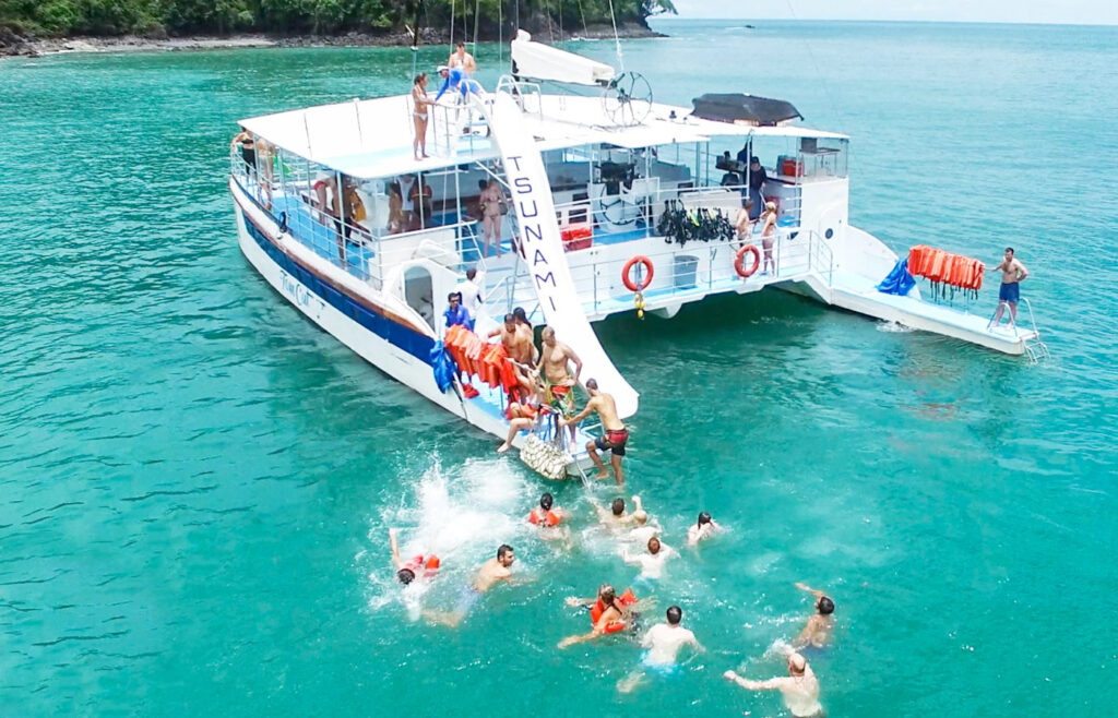 After touring the coast, we will anchor in a special area to enjoy swimming, snorkeling, diving off our second story jump platform, and don’t forget the adrenaline filled ride down the famous Tsunami waterslide in the warm clear Pacific waters.